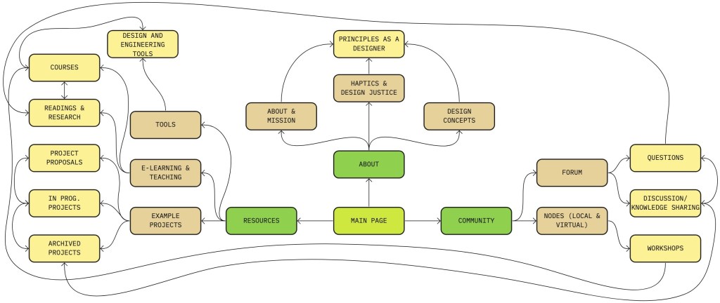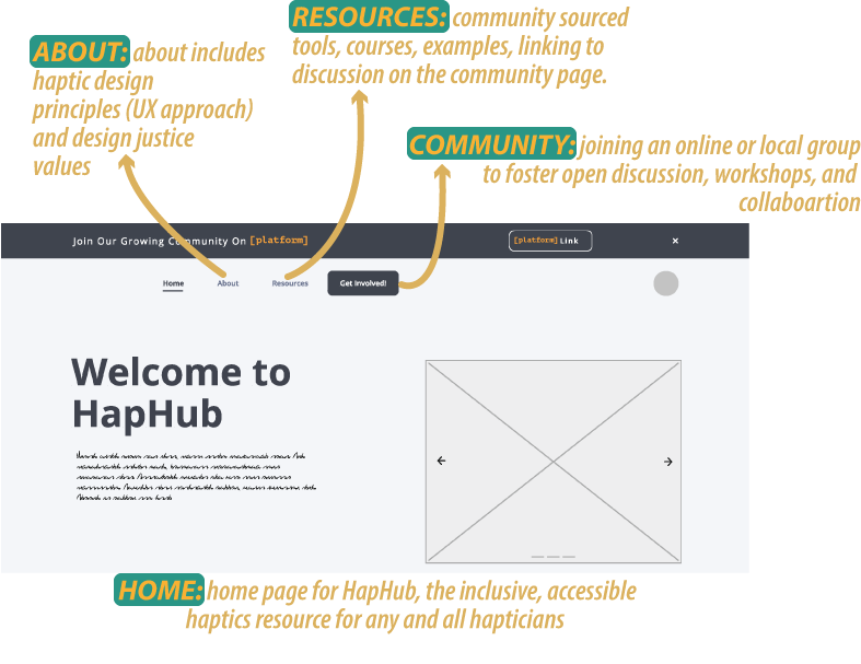 Alongside these hapticians’ perspecitves, I also gathered initial feedback on a low fidelity prototype of a web-based haptics resource called HapHub (this name is still being workshopped). I have been inviting participants to test out this initial design and comment on what they envision as most engaging and helpful for those curious about haptics. What is qualitatively different about the HapHub’s structure and approach is that while it aims to educate on haptic concepts, it also intends to reflexively reframe the role of a designer, researcher, and haptician. Informed by the interdisciplinary nature of haptics, this resource centers community, discussion, and collaboration.