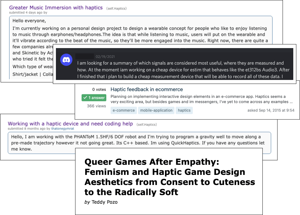 In some of my preliminary browsing I attempted to find a space where the most discussion about haptics was happening online or locally. What I found was difficult to articulate since the climate of information seeking, haptics papers, and general conceptual and technical questions were immensely wide spread over many different sources including conference papers, blog posts, servers (like Discord), forums, and more. Additionally, navigating this space can be daunting if you do not know what you are looking for or where to find it.