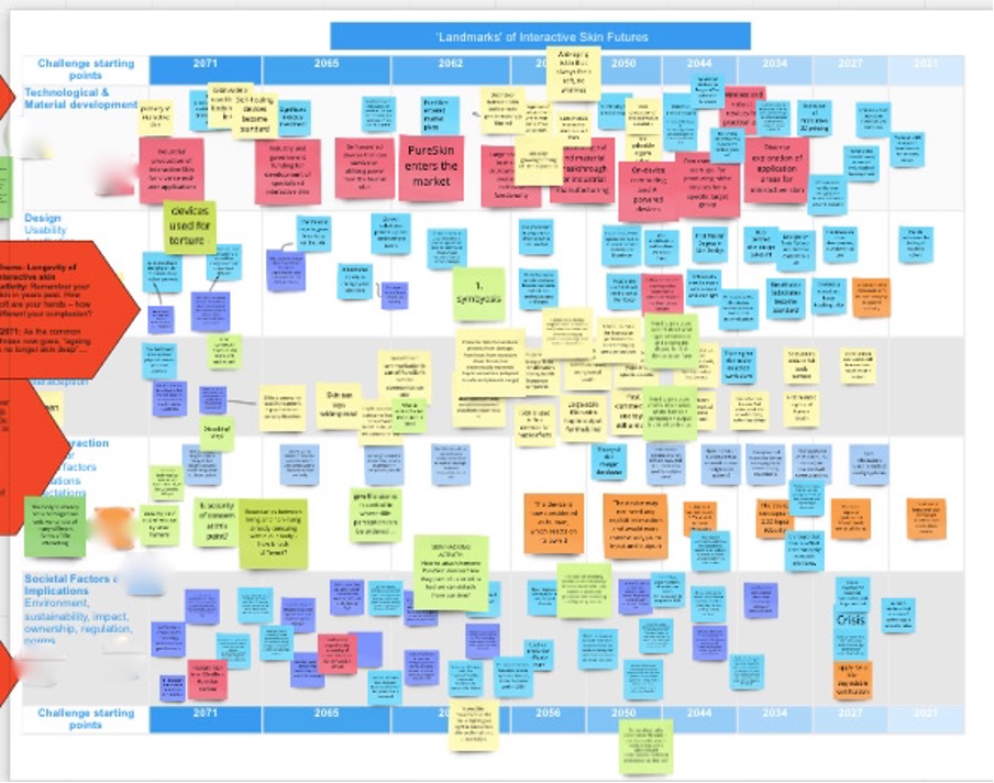 The interactive skin researchers’ probe returns (responses) were used to inform a speculative workshop on the future of interactive skin in week 3. A central part of this speculative design-orientated workshop was an imaginative exercise to plot the key social considerations, possibilities and challenges for interactive skin across various planes (e.g. societal, ethical, technological and interaction design). We participated in this workshop as both facilitators and collaborators.