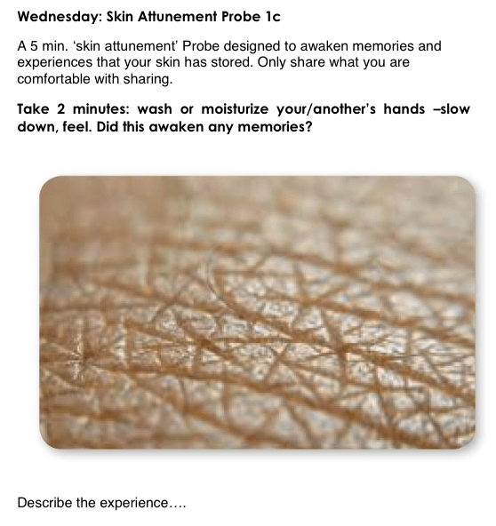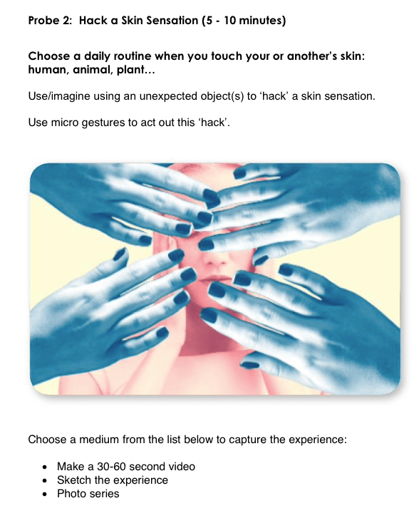 Themes emerging through the interviews and review of the literature inspired the design of online probes that were ‘launched’ as a pack at the start of week 2. Each day participants were also emailed provocations that sought to attune them to the social and sensorial dimensions of touch through playful activities.