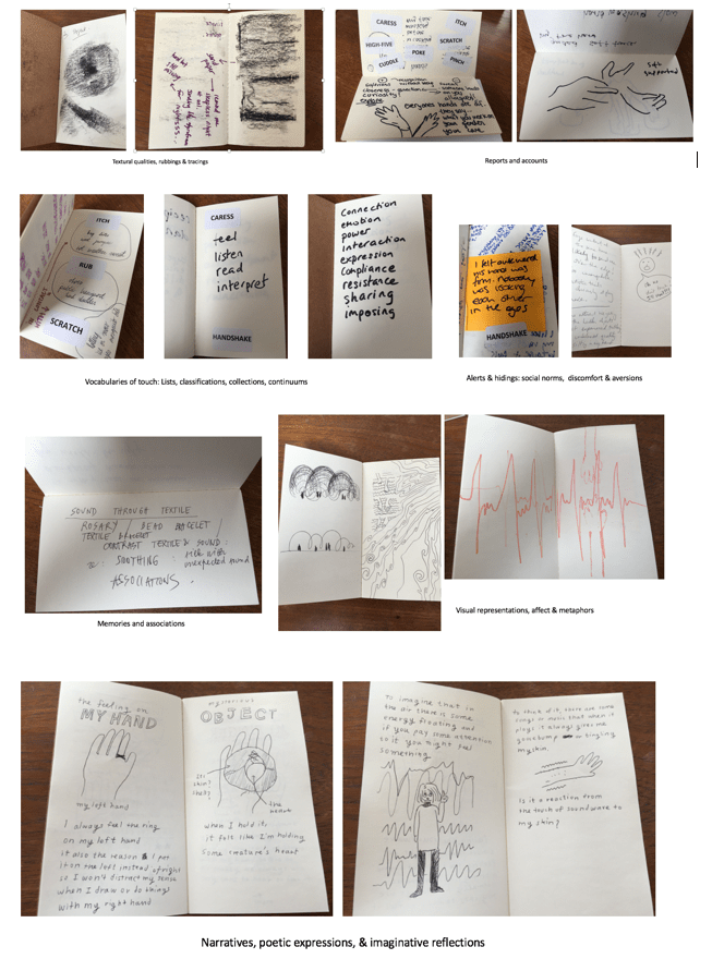 We are collectively analysing the performance materials drawing on our documentation of our encounters (using ethnographic field notes, audio and video recordings, and photographs) to explore the process of getting to a practical collective working method, a trajectory which we regarded as one of the research outcomes. We are also analysing the data collected during the Thresholds performance, from participant notebooks used during the experiment to observe and reflect on their touch experiences.